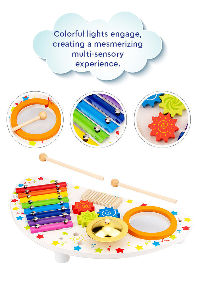 Yes, the instruments except for the percussion sticks are securely attached, providing a seamless and engaging play experience for your child.